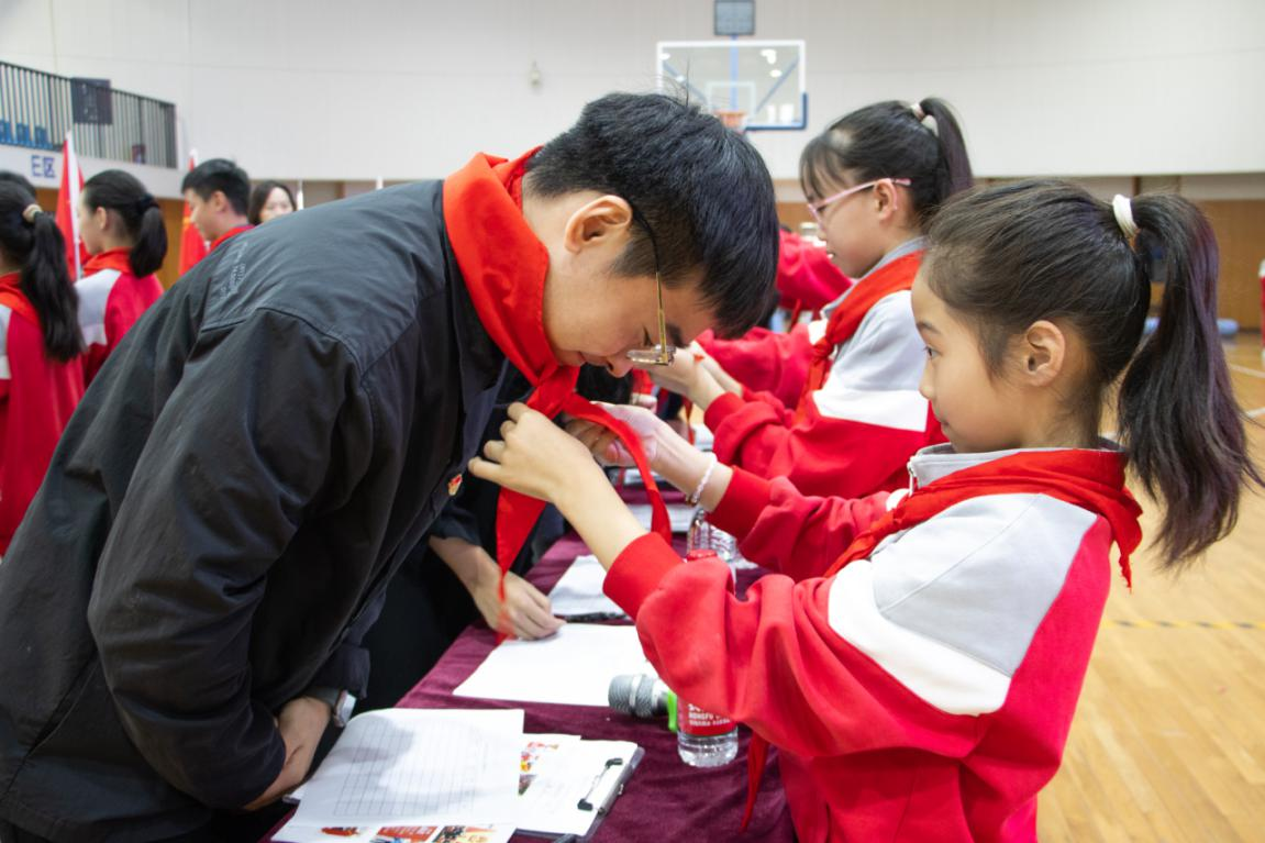 活动伊始,少先队员代表们在轻松欢快的音乐声中为领导们系上红领巾,一条条红领巾既是荣誉的传承,也是责任的传承。
