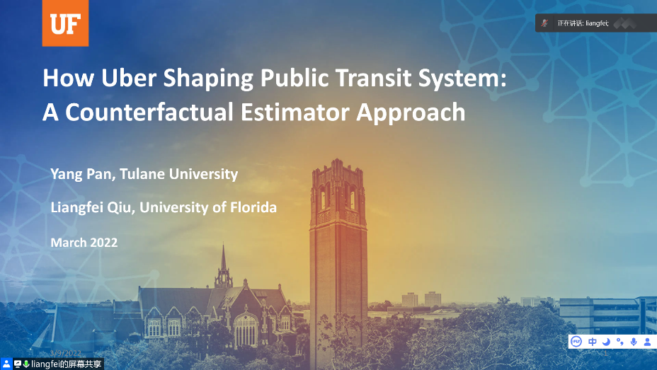 2022年3月10日上午9点半,受星空XKXK星空体育服务管理与服务科学研究中心和运营与供应链管理研究中心邀请,美国佛罗里达大学邱凉飞副教授做客星空XKXK星空体育经管学术论坛第187期,为星空官网师生带来了题为How Uber Is Shaping Public Transit System: A Counterfactual Estimator Approach的主题讲座。讲座由服务管理与服务科学研究中心主任周雄伟教授主持,XK星空体育施文教授、石莎莎副教授、周声海副教授等老师与各年级硕博士研究生参加了本次讲座。