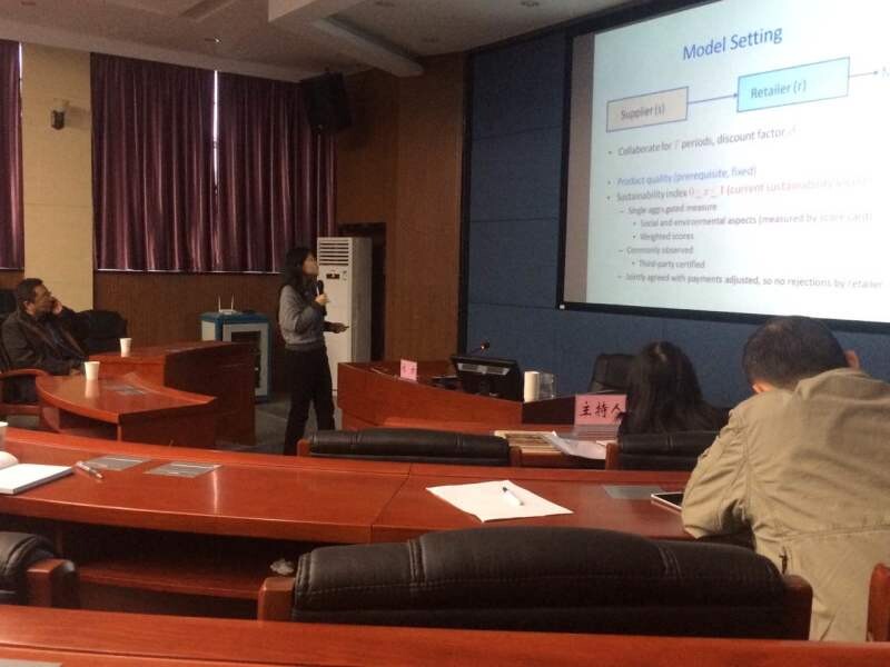 刘方博士以“A Dynamic Mechanism for Achieving Sustainable Quality Supply”为题,与在场老师和学生们进行了精彩的学术交流。刘方博士通过研究Starbucks的供应链管理案例,分析类似企业的上游供应商和下游零售商对产品质量的可持续供应问题,为此设计了一套严谨的动态机制以实现持续的高质量的产品供应,研究结果对致力于供应链的机制设计和企业的供应链管理具有重要的现实意义。报告过程中,刘方博士的汇报栩栩如生、思维严谨、逻辑清晰,深深地感染了在座的每一位师生。 在报告的互动提问环节,现场师生踊跃发言、提问,刘方博士逐一详细地回答了相关问题,最后分享了个人在高水平论文写作、投稿方面的心得体会。