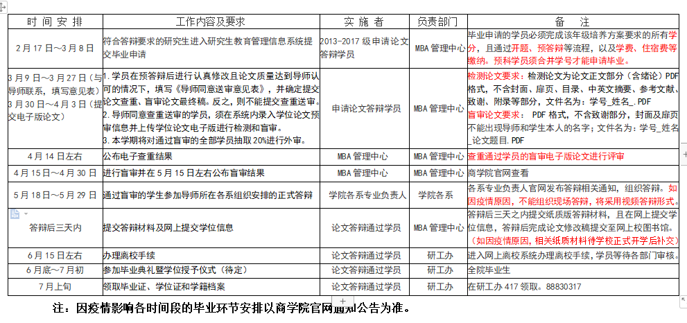 2020年春季研究生(MBA)论文答辩及毕业工作流程表