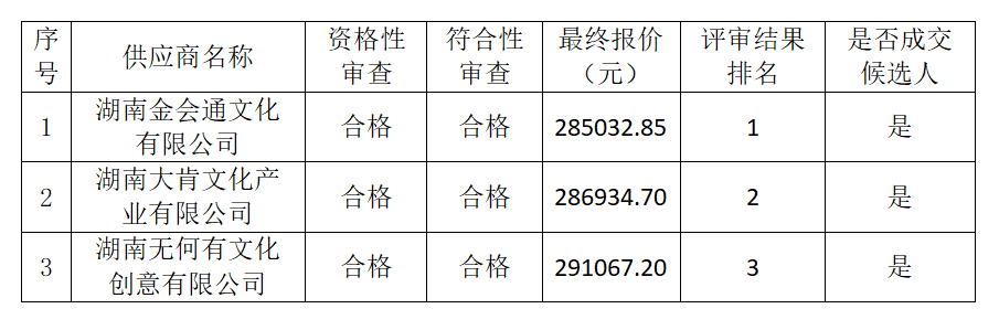 受星空XKXK星空体育的委托,湖南省招标有限责任公司对其星空XKXK星空体育院史展及党建活动室项目进行竞争性磋商采购,经磋商小组评审,现将成交结果公告如下: