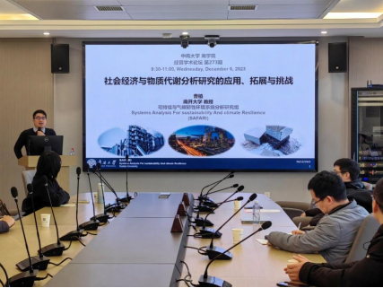 讲座期间,曹教授围绕社会经济与物质代谢分析研究的应用、拓展与挑战展开了深入分析。首先,曹教授介绍了他的学术经历与研究体系。接着,他通过三个案例对社会经济代谢分析框架进行了系统介绍。第一个案例以水泥混凝土产业链为例,在动态物质流分析方法的基础之上,集成各生命周期阶段的单元过程模型,系统评估水泥混凝土全生命周期的物质效率提升空间和减排潜力;第二个案例以风能技术发展的关键材料供需为例,利用基于组件的高技术分辨率动态物质流分析模型,分析风能技术发展过程中关键材料的需求与再生潜力;第三个案例以道路基础设施为例,系统评估了全生命周期的物质效率。