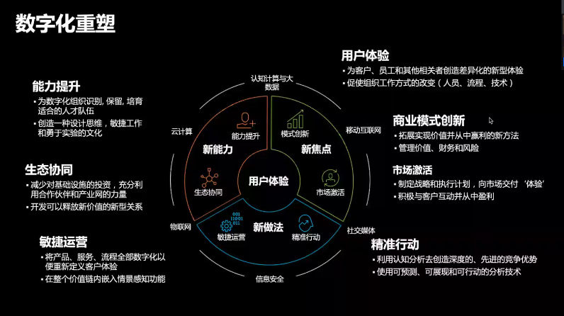 此次讲座主要讲述零售和消费品行业的数字化重塑。首先,从数字化的背景和相关数据出发,指出在当今消费升级时代,消费者核心诉求的快速变化,导致大产品、大传播、大渠道的行业模式正在被颠覆,传统企业依靠规模带来的竞争优势正在失效。其次,从产品的角度来看,稀缺的不仅仅是品质,更是个性化,很多传统企业赖以生存的规模现在正在被新的小的品牌所挑战。其次,在传播方面的改变,主要从以往的营销分离,转变为追求品销合一;而在渠道方面则是全渠道的加速和线性渠道的升级。这些改变推动着数字化的产生,IBM将数字化主要定义了三个层次即数字化、数字化组织和数字化重塑。在数字化重塑方面主要聚焦在新焦点、新做法和新能力,即模式创新、市场激活、精准行动、敏捷运营、生态协同和能力提升。