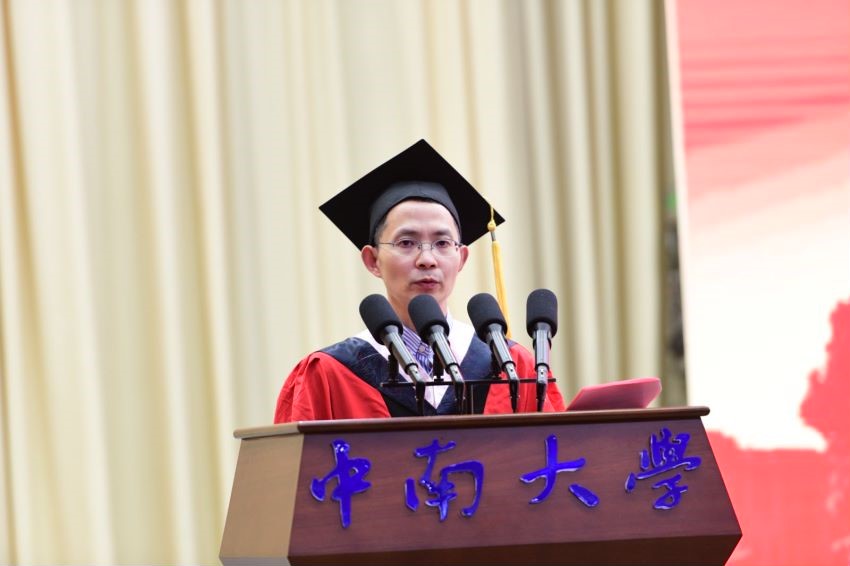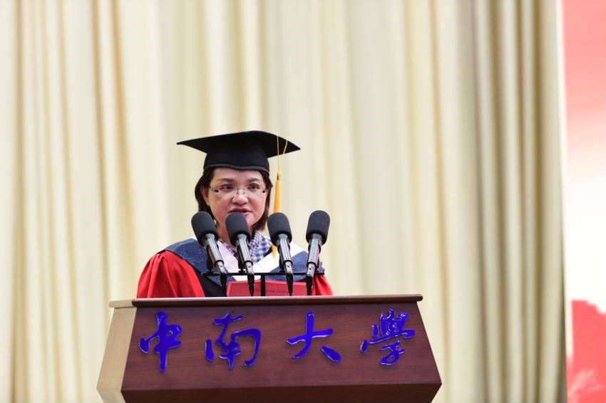 教师代表张红宇对毕业生表达了衷心的祝福与深深的感谢。她祝贺同学们经过中南无数个日夜的锤炼顺利地完成学业,也感谢他们让老师们不断进步并感受到作为人师的欣慰与自豪。