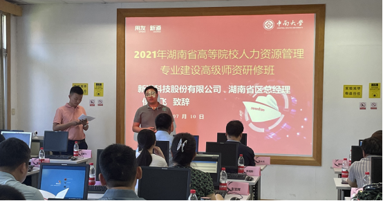 随后,新道科技股份有限公司湖南省区总经理侯腾飞致辞。在发言中侯总首先感谢星空XKXK星空体育在此次培训中提供的支持与帮助,对于此次参训的老师们表达由衷的欢迎。今年也是新道科技有限公司成立的第十年,作为平台型教育服务企业,新道教育希望汇聚政府、行业、企业、院校多方力量,共同服务院校数智人才培养,服务产业升级,推动中国教育事业和中国数字经济的进步与发展。