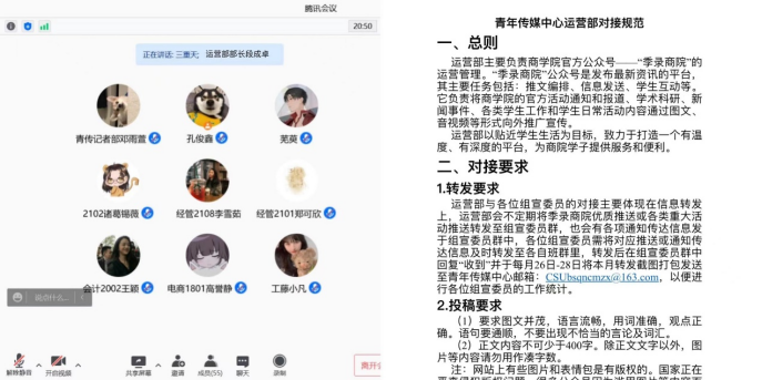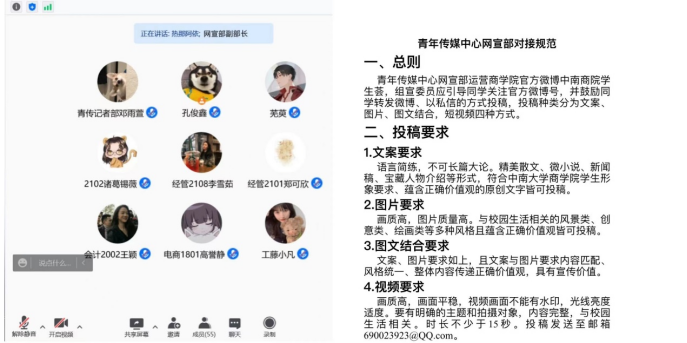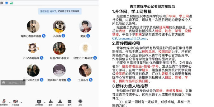 最后,赵自游细述记者部对接规范,并针对升华网、学工网投稿规范,青传图库投稿规范,榜样力量人物推荐规范进行讲解。条理清晰,简洁明了。