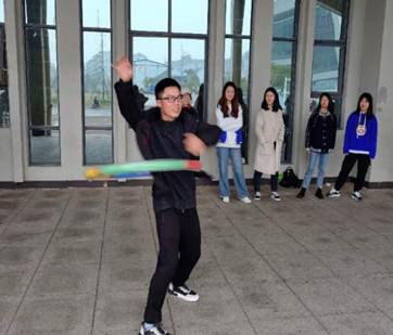 随后是“呼啦圈过山车”游戏,团体赛以用时长短分输赢,而个人战中,孙兆敏、徐梦雪和唐志明同学以出色的表现各获得了一份小奖品。
