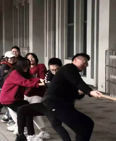 热身完毕,师生们逐渐进入状态。在随后的拔河项目中,在场师生混合组成两队,采取三局两胜制。最终,李苑老师所带领的队伍以2:0的比分赢下拔河赛。