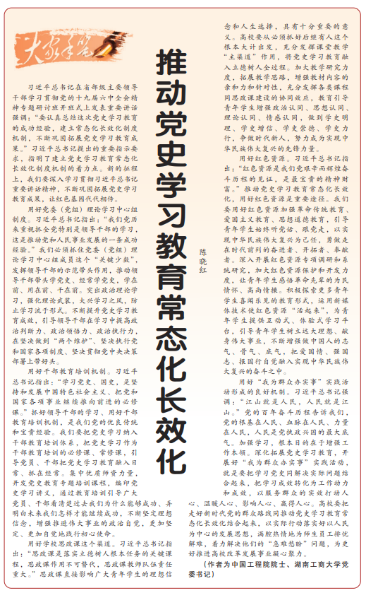 习近平总书记在省部级主要领导干部学习贯彻党的十九届六中全会精神专题研讨班开班式上发表重要讲话强调:“要认真总结这次党史学习教育的成功经验,建立常态化长效化制度机制,不断巩固拓展党史学习教育成果。”习近平总书记提出的重要指示要求,指明了建立党史学习教育常态化长效化制度机制的着力点。新的征程上,我们要深入学习贯彻习近平总书记重要讲话精神,不断巩固拓展党史学习教育成果,让红色基因代代相传。