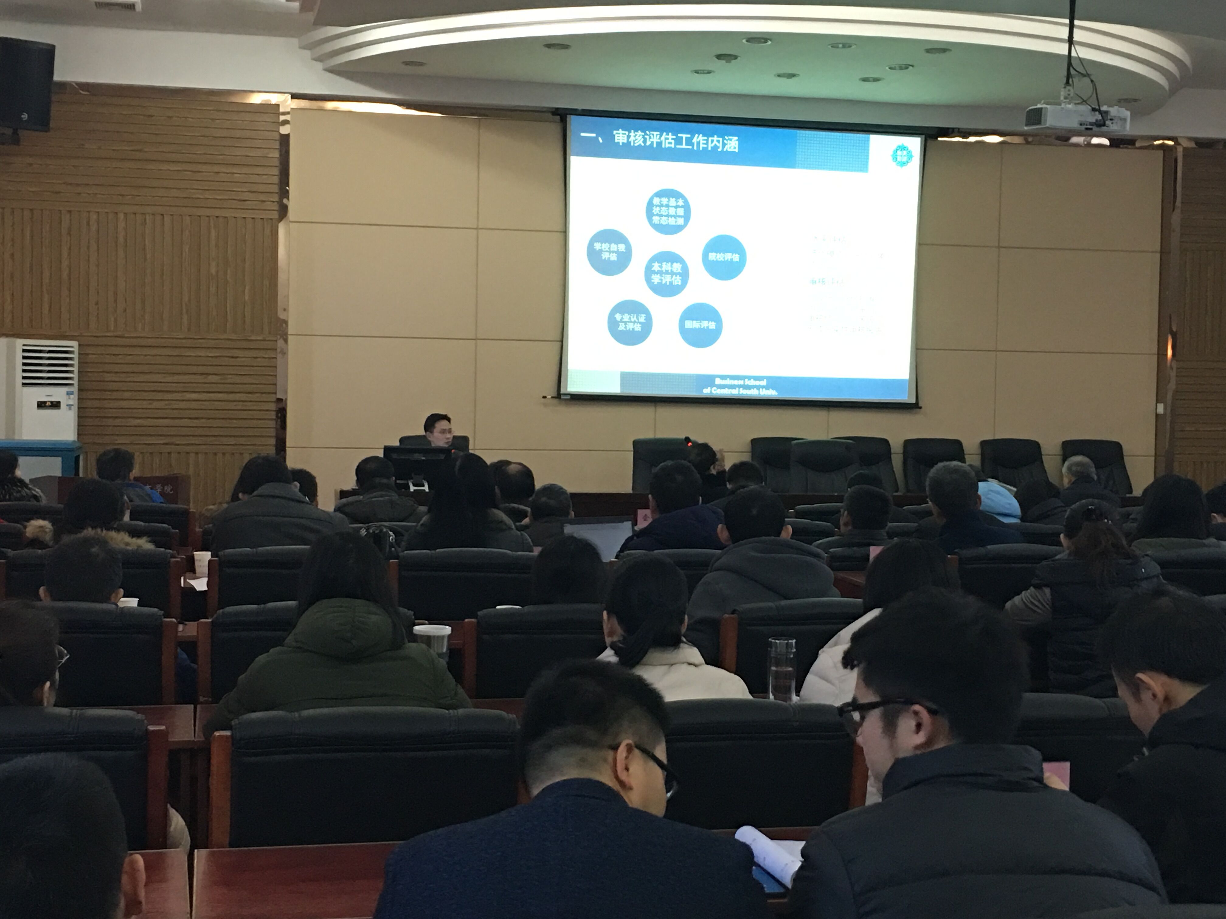 龚院长首先指出了审核评估的重要性,要求全院教师及相关部门高度重视,积极配合;然后是学院本科教学主管院长任胜钢教授做了本科教学审核评估的内涵与实施的报告。任院长从审核评估工作的内涵、要素释义、工作要求、学院正在开展的工作和需要全院教师知晓配合事项等六个方面介绍了审核评估相关内容,并进行了工作布署;最后是颜爱民教授结合国家级精品视频公开课“中国情景下的人力资源管理实务”的申报与建设,分享了课程建设的经验与体会。
