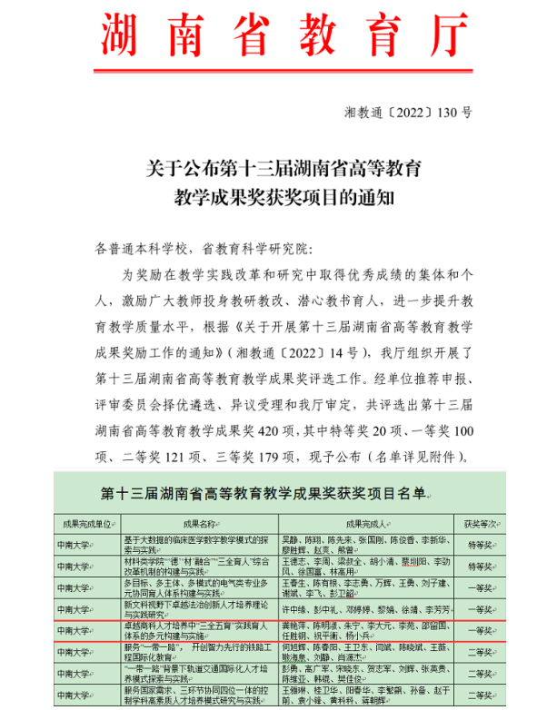 近日,省教育厅发文公布第十三届湖南省高等教育教学成果奖获奖项目,星空官网龚艳萍院长牵头申报的成果《卓越商科人才培养中“三全五育”实践育人体系的多元构建与实施》荣获一等奖。湖南省高等教育教学成果奖每四年评选一次,旨在奖励在教学实践、改革和研究中取得显著成果的单位和个人,发挥教学成果的引领示范作用,是我省教育领域最高层次的奖励。