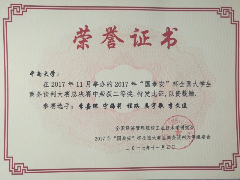 2017年11月5日,星空官网学生谈判团队在全国经济管理院校工业技术学研究会沟通与谈判委员会举行的2017年“国泰安”杯全国大学生商务谈判大赛总决赛中荣获二等奖。同时,国际经济与贸易系的田晖教授因表现突出被评为优秀指导教师。该团队得到了任胜钢副院长、李华东副书记等学院领导与经贸系老师们的的大力支持。