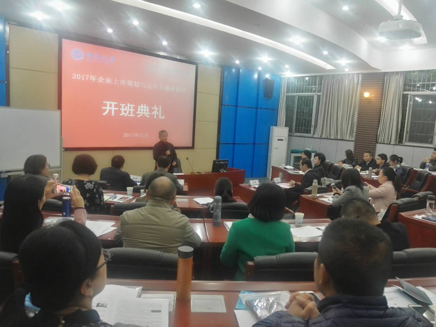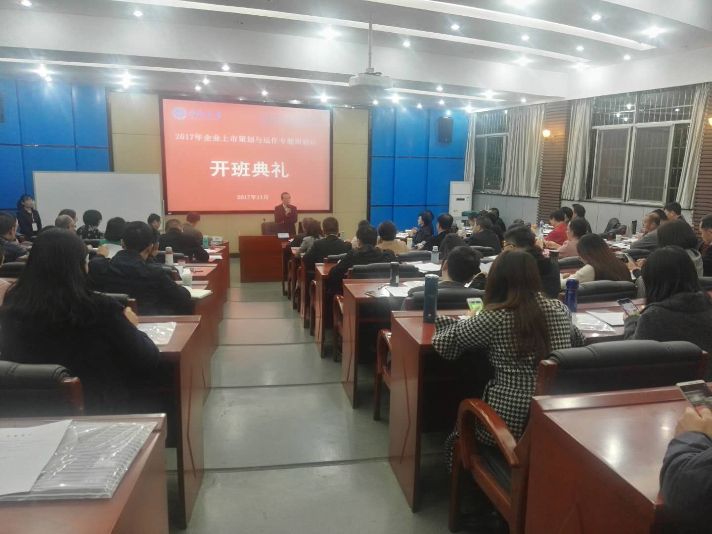 2017年11月13日,企业经理人企业上市策划与运作专题研修班在星空XKXK星空体育管理楼官阶一教室正式开班。东莞市经济和信息化局市中小企业局(民营经济发展服务局)郑文志局长、市中小企业局刘福亮副局长、星空XKXK星空体育张颖副院长,以及60余位企业经理人参加了开班典礼。