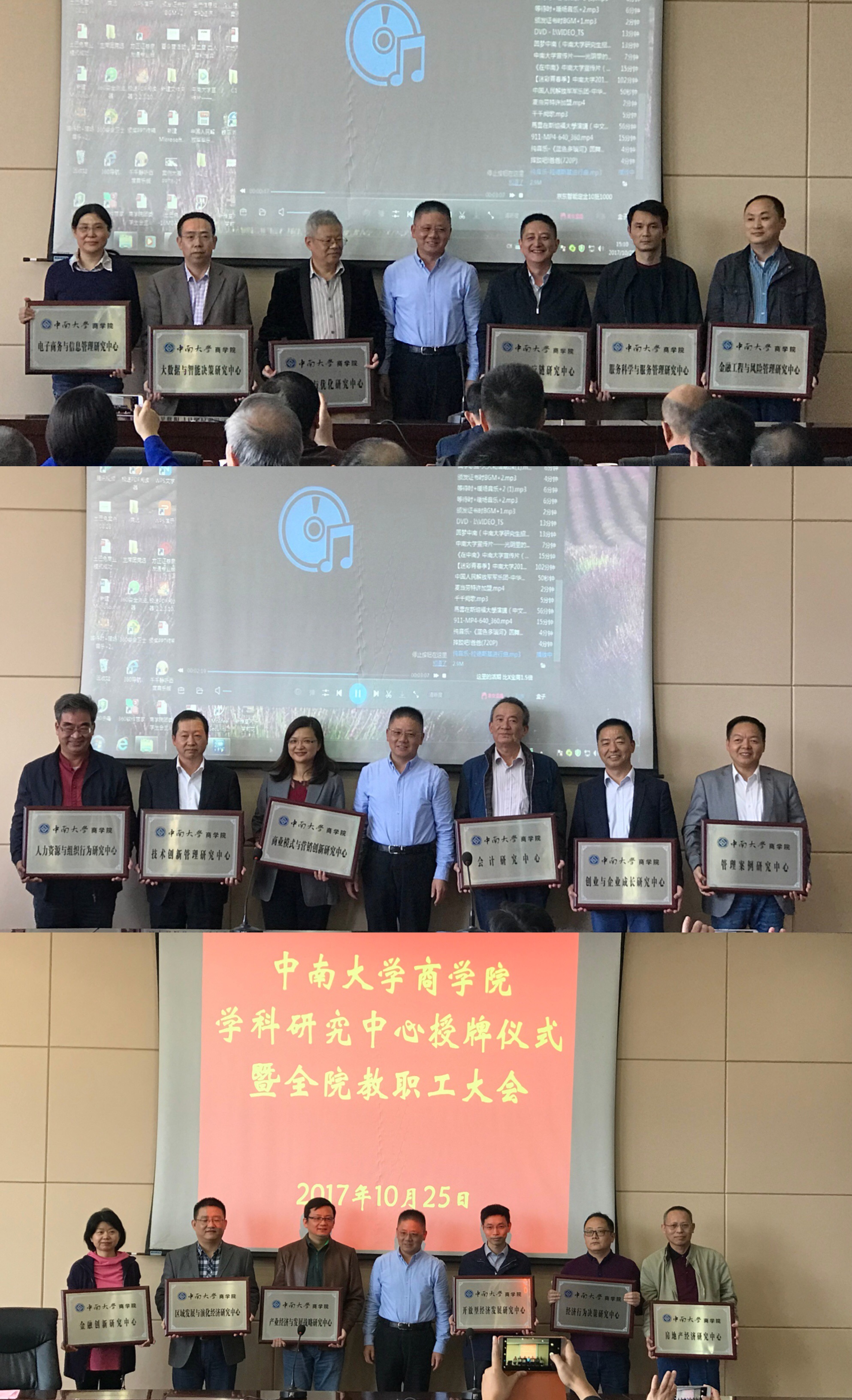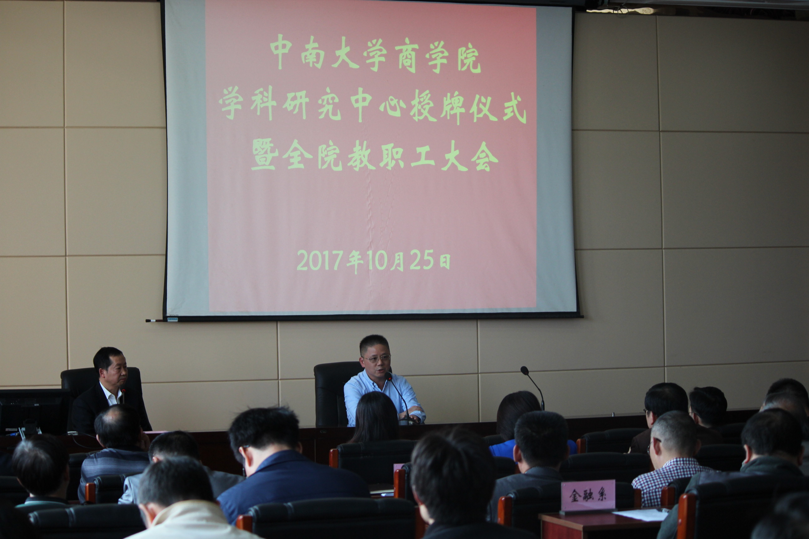 授牌仪式结束后,随即召开院教职工大会。会上,游达明书记对完善学院党建工作机制作了部署,并对部分党支部换届情况作了详细说明;李华东副书记强调了学生安全及研究生导师制的重要性;任胜钢副院长对学院本科教学工作目标及重点作了介绍;王宗润副院长结合学院文件强调,学院鼓励并全额资助教师参加国内外相关学术会议,并支持以研究中心为单位举办会议;刘咏梅副院长和关健副院长相继就学院国内外专家引进、项目及职称申报管理办法进行了解释;毕文杰院长助理对学院高水平论文鼓励制度以及ESI经济学与商学论文发表的奖励办法作了说明。