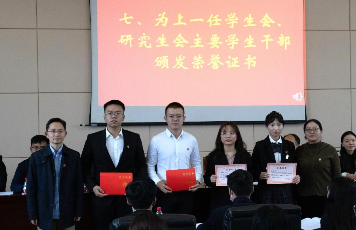 XK星空体育港澳台学生工作专干陈文老师、XK星空体育研工办副主任卢思远老师分别为第二十届学生会主席团、第二十二届研究生会主席团颁发荣誉证书。