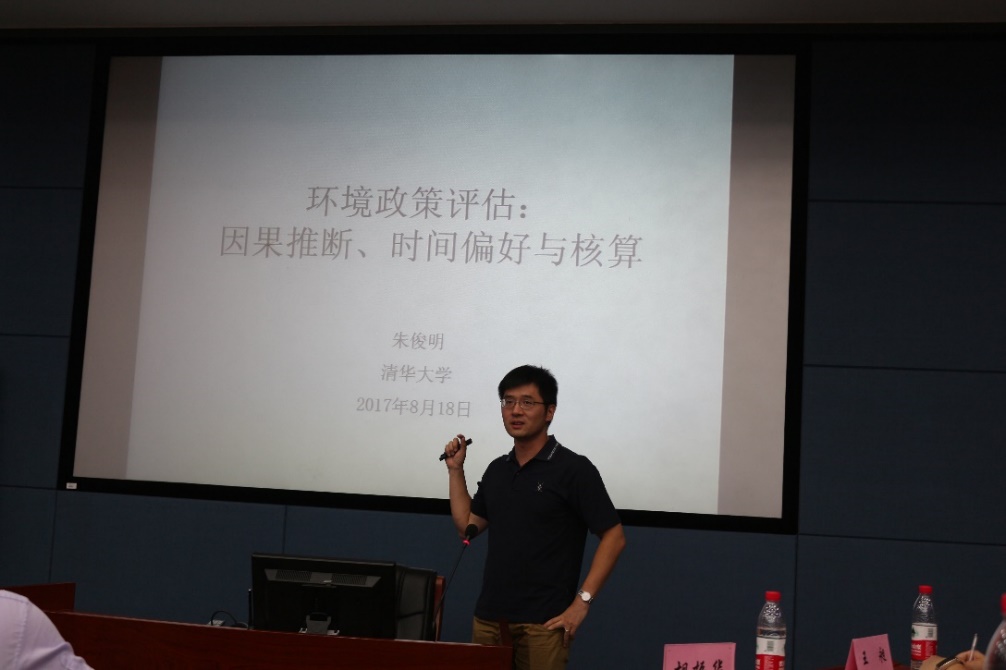 清华大学朱俊明助理教授做了《环境政策评估:因果推断、时间偏好与核算》报告,他主要从为什么要进行