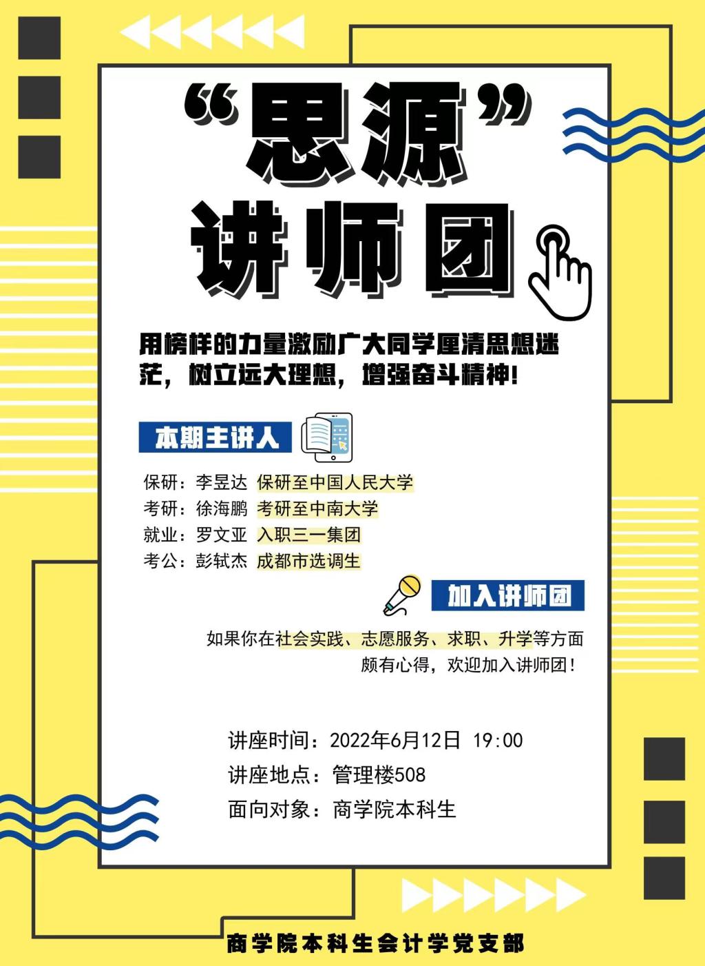 XK星空体育会计党支部在就业工作中充分发挥基层党组织的战斗堡垒作用,勇于开拓创新组建“思源讲师团”,招募在升学、求职、社会实践等方面杰出的学生讲师,面向以19级本科生为主体的就业群体,从升学、就业、考公等多方向开展讲座。该项目也在今年获得星空XK思想政治工作实践项目立项。