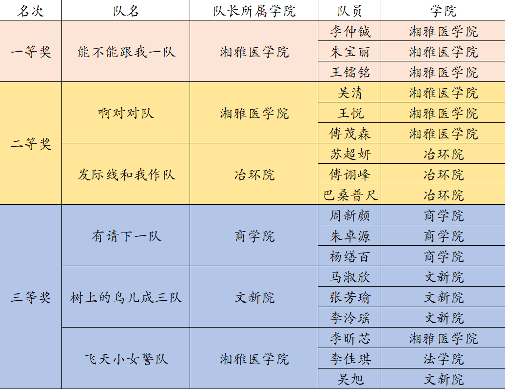 经过激烈角逐,共有6支队伍脱颖而出。“能不能跟我一队”勇夺桂冠,“啊对对队”和“发际线和我作队”获得二等奖,“有请下一队”“树上的鸟儿成三队”和“飞天小女警队”获得三等奖。姚勇副部长、陈文老师、万可老师分别为各获奖队伍颁发证书及奖品。