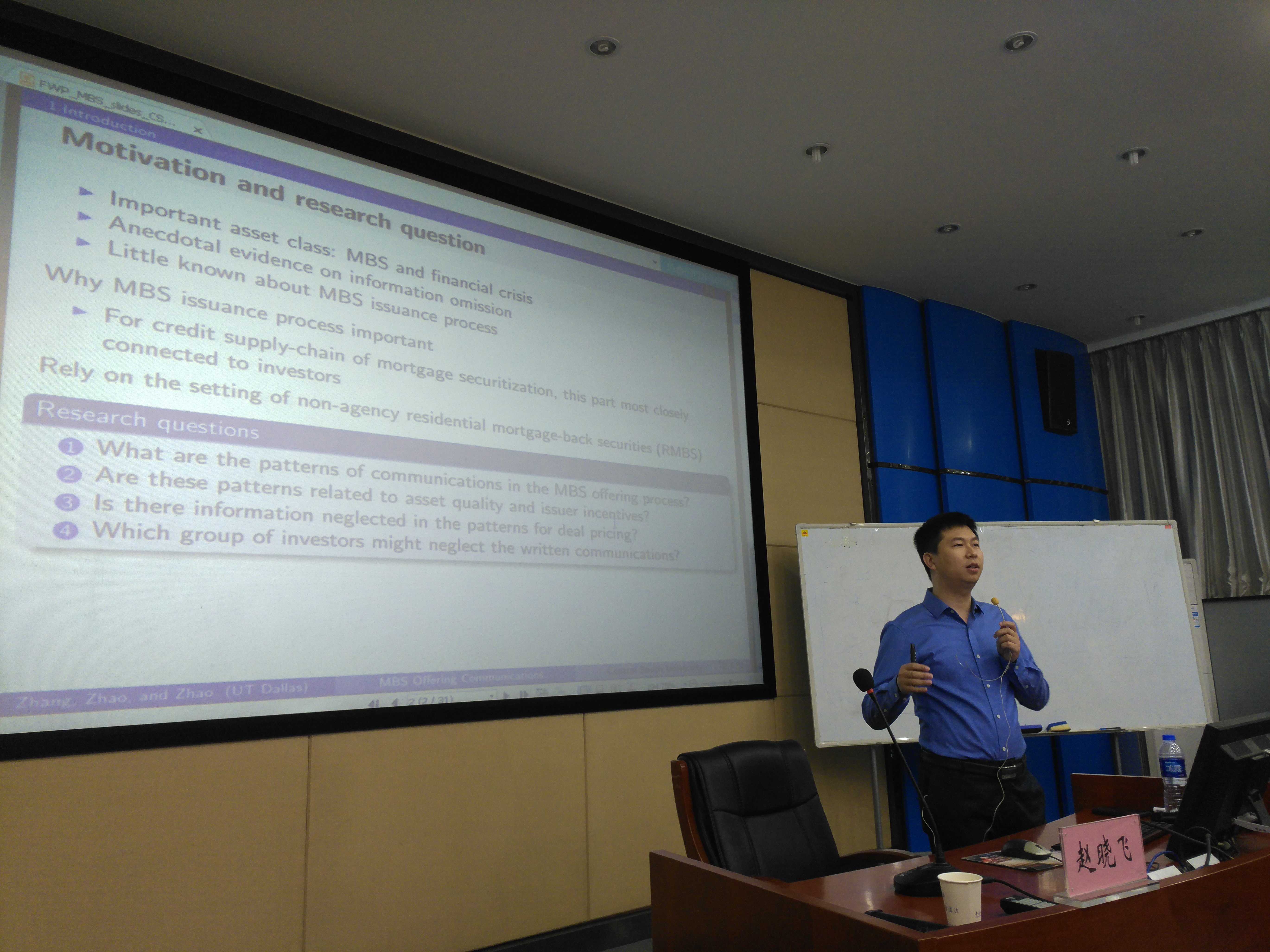 5月27号上午9点,赵晓飞博士在管理楼官阶一教室做了题为“隐藏在文字背后的信息:抵押贷款支持证券(MBS)发行过程的信息传递研究”的精彩学术报告。报告会由XK星空体育副院长王宗润教授主持,王建新老师以及相关研究生参加。