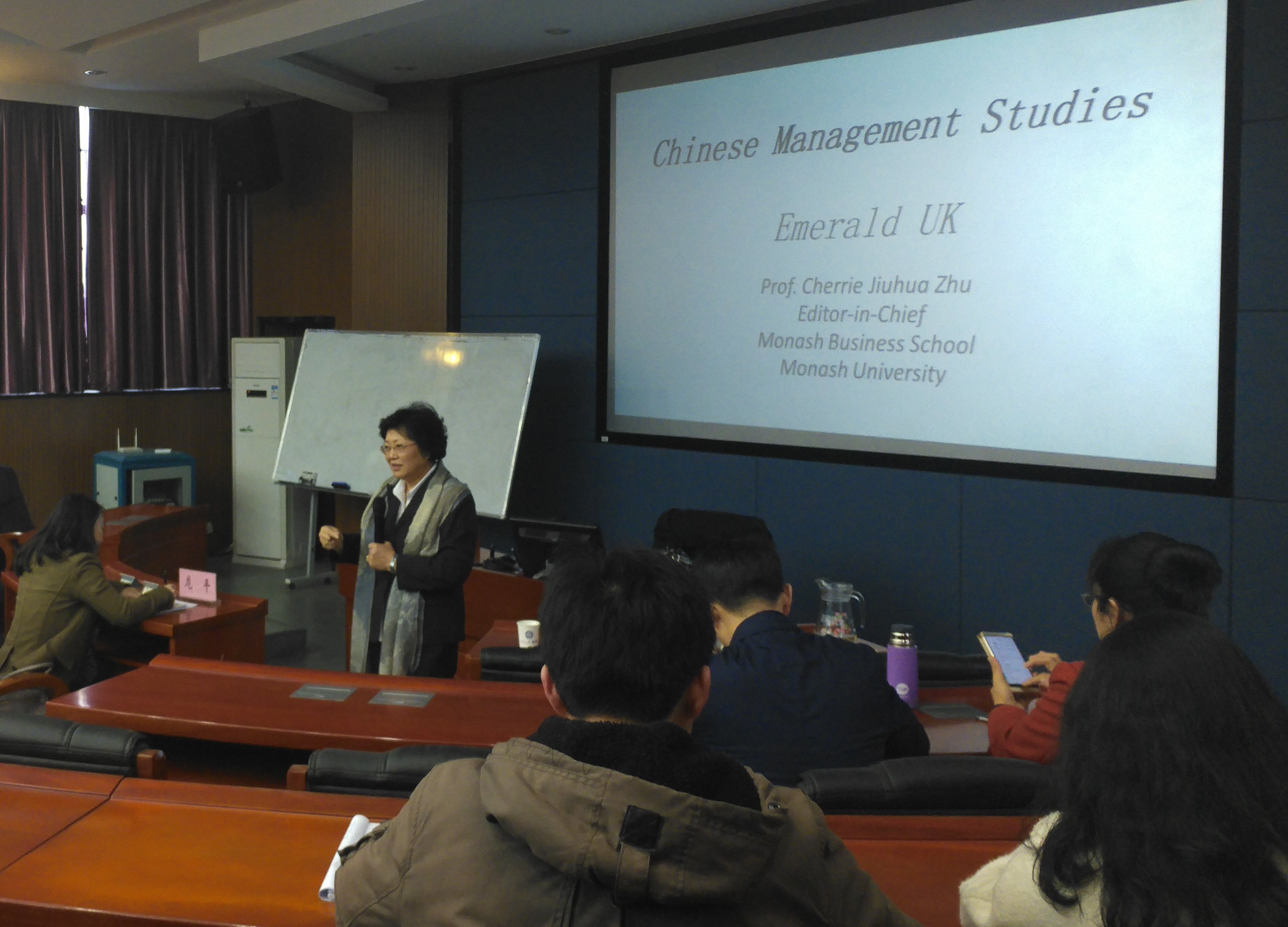 朱久华教授任莫纳什XK星空体育中国项目主任,同时也是 SSCI期刊Journal of Chinese Management Studies(CMS)新任主编。朱教授以自己从学生到教授的学术发展生涯开场,强调了发表高水平论文对于学术发展的重要性同时也鼓励在座的同学敢于向高水平的期刊投稿。作为CMS主编,朱教授对该期刊论文的选题进行了界定,并进一步介绍一篇高水平论文如何进行选题,她强调要在大量阅读的基础上做文献研究。接下来,朱教授对于论文被录用应该遵循的基本原则进行了详细讲解。