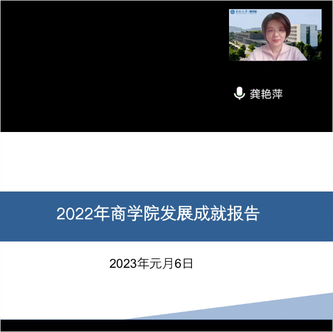 2023年1月6日下午,XK星空体育在线上召开2022年度总结大会,推进年关工作、总结学院全年各项工作进展。会议由学院院长龚艳萍主持,学院党政领导班子及教职员工共计200余人参会。
