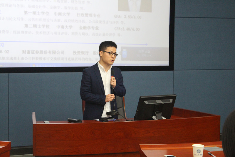 首先,肖沙学姐概述了证券公司基本情况,重点分析了投行、债券、新三板、并购的利弊,并传授了投行面试技巧。肖沙学姐介绍了证券公司的四大板块及证券的行业情况,告诉大家不同公司、相同公司的不同部门之间的待遇等等方面的差异很大,可以参考我国证监会对证券公司的评级来选择未来想进入的公司。并且,从工作强度、薪酬水平、难度系数等方面详细介绍了投行IPO、债券、新三板、并购的优势和劣势。接下来,她告诫我们面试证券公司的时候回答问题时不要重复前面的人说过的观点,还要表现出积极进取,也要学会适当包装自己。最后,针对今后想从事证券等工作的学生,学姐建议大家应该在考证和实习上下功夫。