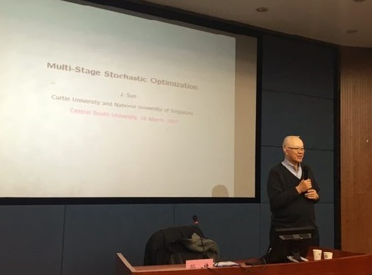 3月18日下午三点,由澳大利亚科廷大学孙捷教授主讲的题为“求解单调多阶段随机变分不等式”的讲座在XK星空体育管理楼管阶二教室顺利举行。讲座由XK星空体育副院长王宗润教授主持,徐选华教授、邓松海副教授(数学与统计学院)、郑亮(交通运输工程学院)等老师及相关研究生参加了本次报告会。