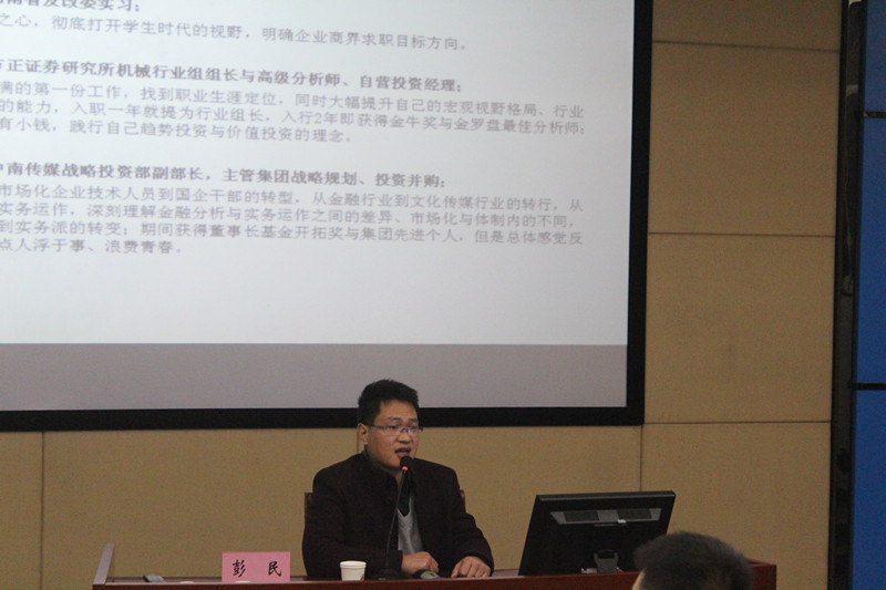 伴随着热烈的掌声,彭民师兄开始分享自己的工作经历及感受。从高级分析师、投资经理,到中南出版传媒集团股份有限公司战略投资部副部长,再到湖南源乘投资管理有限公司副总经理,如今,他已担任长沙开元仪器股份有限公司副总经理一职。一路走来,他的感受是如果大家想要在职场上取得成就,一定要结合自身的特点和整个行业背景,找准职业定位,并且要善于汲取失败的经验。然后,他着重分享了自己对分析师这个职业的理解,主要从成功的分析师类型、如何形成个人影响力等方面阐述。接着,他谈了自己职场成长路程中的体会,勤奋务实、真诚担当、激情恒心、不拘小利、善于学习和总结等是有所成就的关键因素。最后,彭师兄建议大家做好时间管理与压力承受能力调练,化目标为兴趣爱好,并在学习之余兼顾爱情、实习、旅行等。