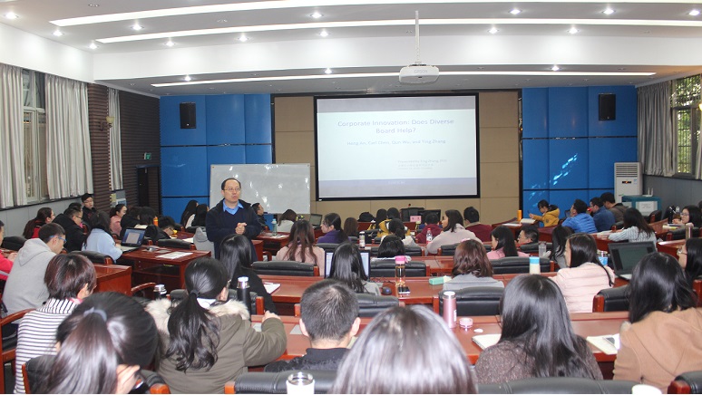 6日,张霆副教授首先做了题为“Corporate innovation: Does diverse board help?”的学术报告。他向大家提出了三个问题:如何衡量董事会多样性?如何测量企业创新?董事会多样性与企业创新之间的关系究竟如何?而后对每个问题进行了简要的解释,从而让同学们了解该论文的大致内容,并且告诫大家写文章时,也应该首先思考这三个基本的问题。随后,他详细介绍了董事会多样性和企业创新的衡量指标体系,并指出其贡献在于这些指标是全面的、综合的。张教授认为,相对指标体系的构建,如何量化每个指标却具有一定的难度。然后他不仅介绍了本文每个指标的测量方式,而且也说明测量方式不是唯一的,可以根据自己的研究进行取舍。
