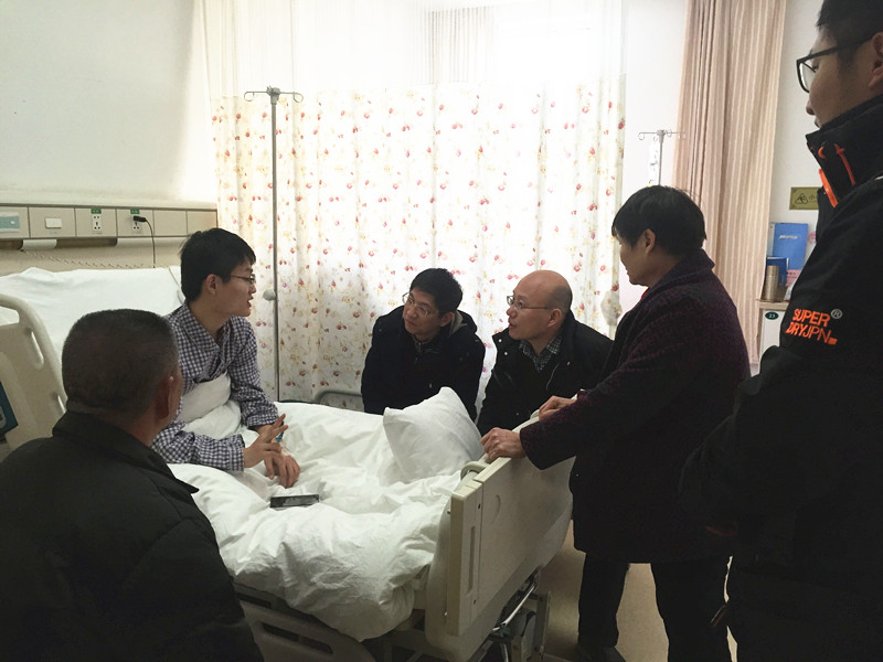12月01日下午,校党委学生工作部余文武部长在XK星空体育党委李华东副书记、学工办辅导员王皓、张欢欣陪同下来到湘雅医院放射介入科,看望住院治疗的XK星空体育信息管理与信息系统1302班孙技,并代表学校慰问学生及家长。