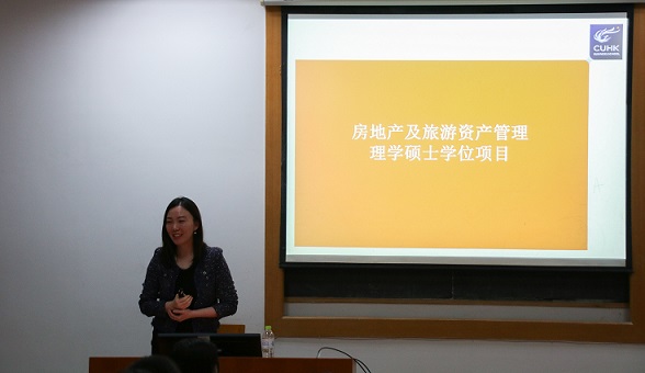 接下来,香港中文大学MSc in Management of Real Estate & Hospitality Assets课程执行主任潘倩瑜老师对香港中文大学及其XK星空体育做了详细介绍,包括校园建设、人才培养及社会服务等多方面内容。随后潘倩瑜老师对本次宣讲的主题——“2017-2018年房地产及旅游资产管理学硕士的攻读”进行了细致的讲解,其内容涵盖了师资力量、课程特色、就业去向、申请条件等同学们最为关注的方面。在最后设置的答疑环节中,潘倩瑜老师耐心地解答了XK星空体育同学提出的问题,将现场的氛围推向了高潮。