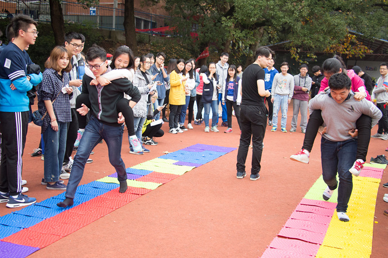 比赛伊始,操场上摆起两排缤纷的指压板,由一位男生背一位女生以最快的速度跑过如针扎般的指压板。哨声落下,两对男生步如箭发,尽情释放积蓄已久的爆发力,中程的碰撞激发出拼搏的火花,两人之间的精诚合作是取胜的关键。场边观众的呐喊更成为无需修饰的靓丽风景。