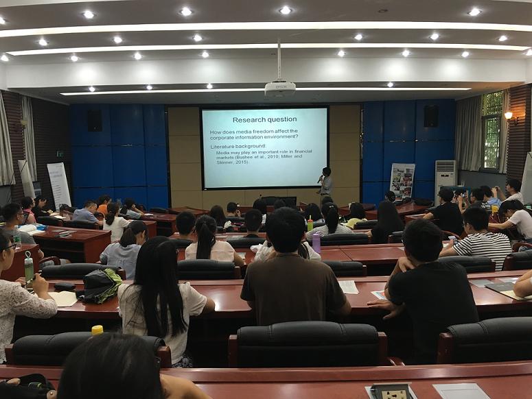 在本次讲座中,张勇副教授将自己与芝加哥大学Dr. Philip Berger合作的题为“Media freedom and the corporate information environment”的研究成果作了详细介绍,他主要以美国的一部分公司为研究对象,分析媒体自由如何影响公司的信息环境。首先,他介绍到媒体在金融市场中的作用是一个比较新的研究领域,而媒体主要有两大作用:一是传播现有信息,二是创造新的信息。随后,张勇副教授简明介绍了研究假设、媒体自由的测量方法、回归模型、控制变量、样本选择、数据来源等内容之后,详细阐述了自己的研究结论,研究发现在美国以外的低媒体自由会带给外部投资者和管理人员较高的信息不确定性,当地金融分析师频繁的调查活动在一定程度上可以弥补媒体不自由带来的信息缺失。