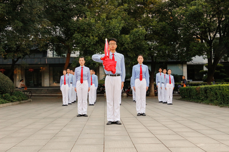 升旗仪式于6点50分准时开始,全体国旗班成员以及所有观礼师生早已到达升旗现场,静待国旗的升起。擎旗手肩扛国旗走在队伍最前方,带领着整个护旗方阵,踏着矫健的步伐,以饱满的热情,庄严地护卫五星红旗进场。整齐的步伐,有力的摆臂,干净利落的转体,无一不是年轻向上的标志。