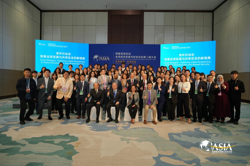 10月29日下午2:30,以星空官网袁康、毛一鸣等40名博硕士研究生为代表的青年代表团,在卢思远老师带领下,参加以“探索全球发展与共享安全的新视角”为主题的青年对话会。对话会由博鳌亚洲论坛全球经济发展与安全论坛大会主席曾伟雄主持,博鳌亚洲论坛理事长、联合国前秘书长潘基文,博鳌亚洲论坛理事、菲律宾前总统阿罗约和清华大学苏世民书院常务副院长潘庆中教授分别进行了致辞。