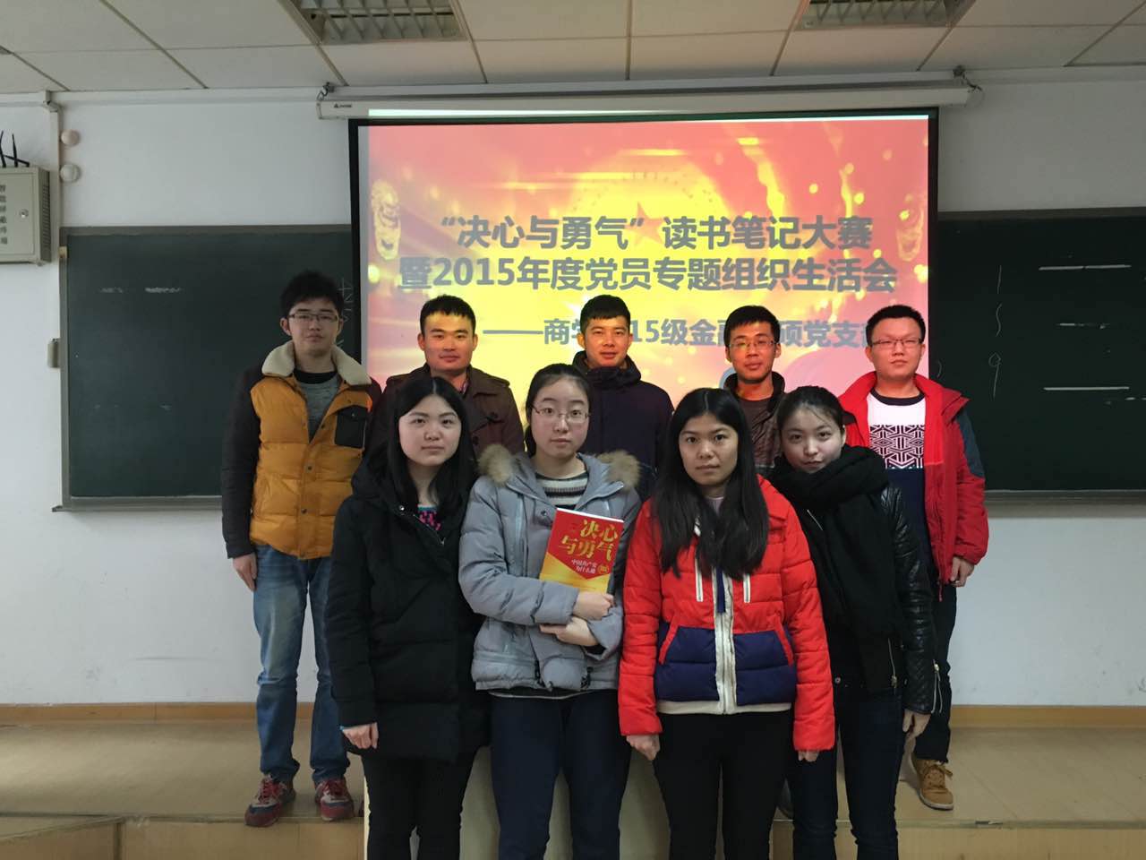 2016年1月10日,XK星空体育15级金融硕士党支部“决心与勇气”读书笔记大赛暨2015年度党员专题组织生活会在科教北楼204教室顺利召开。本次活动一共分为两个部分,第一部分是关于指定书籍《决心与勇气》的读书笔记大赛,第二部分是开展广泛交心谈心,自评互评讲评,畅谈新年愿望,表述决心勇气的专题组织生活会。