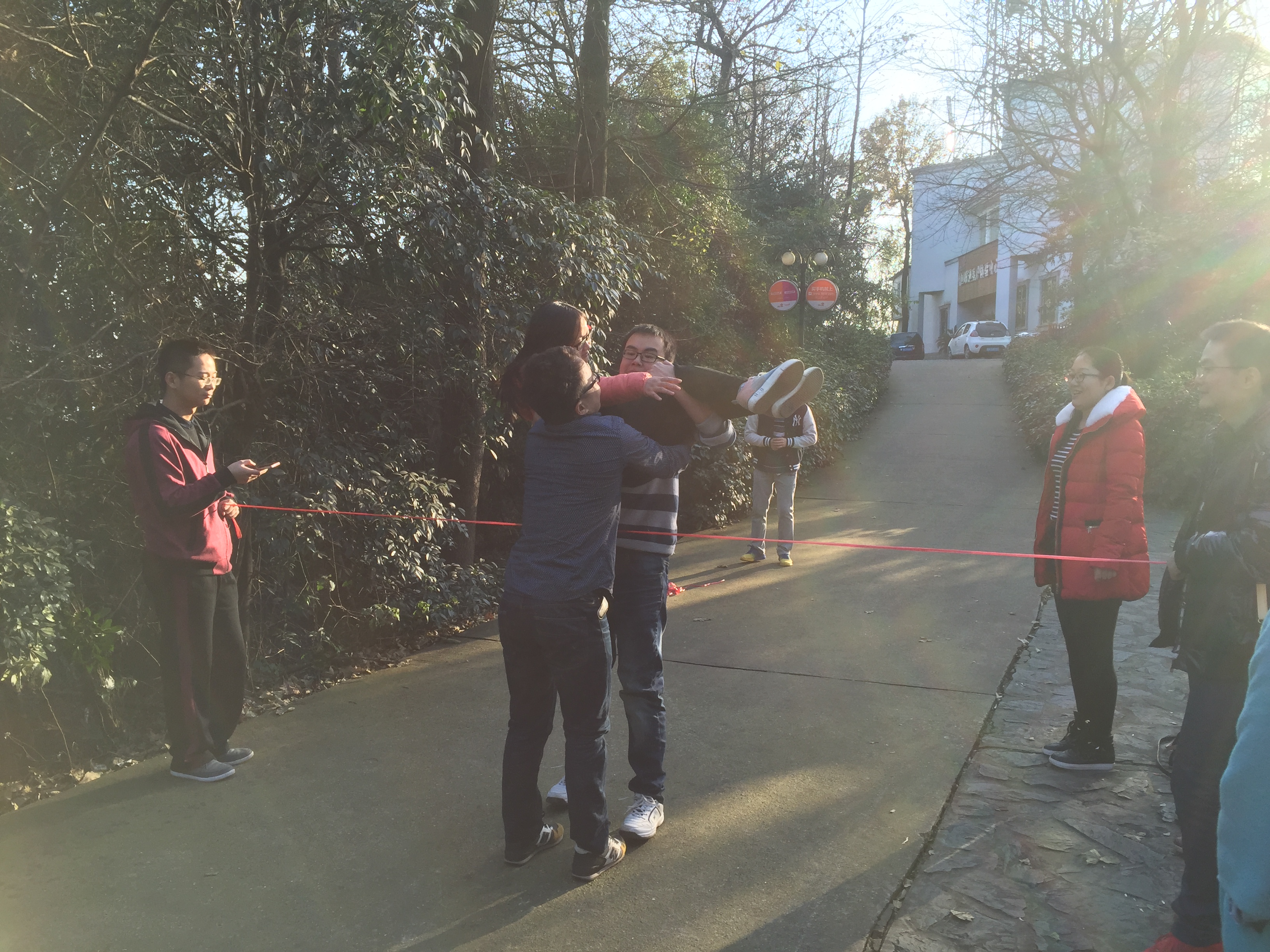 在接近三个半小时的活动中,大家途经云麓宫、长沙会战碑、响鼓岭、黄兴墓及观日台,于观光长廊附近开展了团队竞技拓展活动。所有党员与群众随机分为四组,共同参与了“翻越雷网”、“猜猜我是谁”等活动环节。在“翻越雷网”中,各组成员需要在徒手条件下共同翻越高1.2米的“雷网”;而在“猜猜我是谁”的环节中,各组代表更是要在蒙眼条件下识别出已经换装后的其他组成员。活动结束后,根据各组成员活动过程中组织、竞技表现及气质合影进行评价,并颁发纪念奖品。