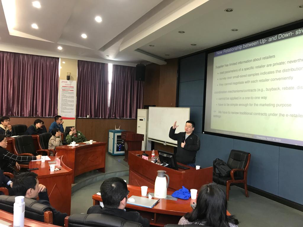 2019年4月16日下午,华中科技大学管理学院Robust Team的李建斌教授和胡鹏教授应服务科学与服务管理研究中心和运营与供应链管理研究中心邀请来访XK星空体育,并在管阶二教室分别开展了 “Optimal Remanufacturing Strategies with Name-You-Own-Price Recycling”和“Dynamic Inventory Management with General Replenishment Cost Structure”的主题讲座。会议由XK星空体育副院长刘咏梅教授主持,周艳菊教授、徐选华教授、许民利教授、施文教授、周雄伟副教授、储军飞副教授和简惠云老师等XK星空体育相关教师和研究生参加了本次讲座。
