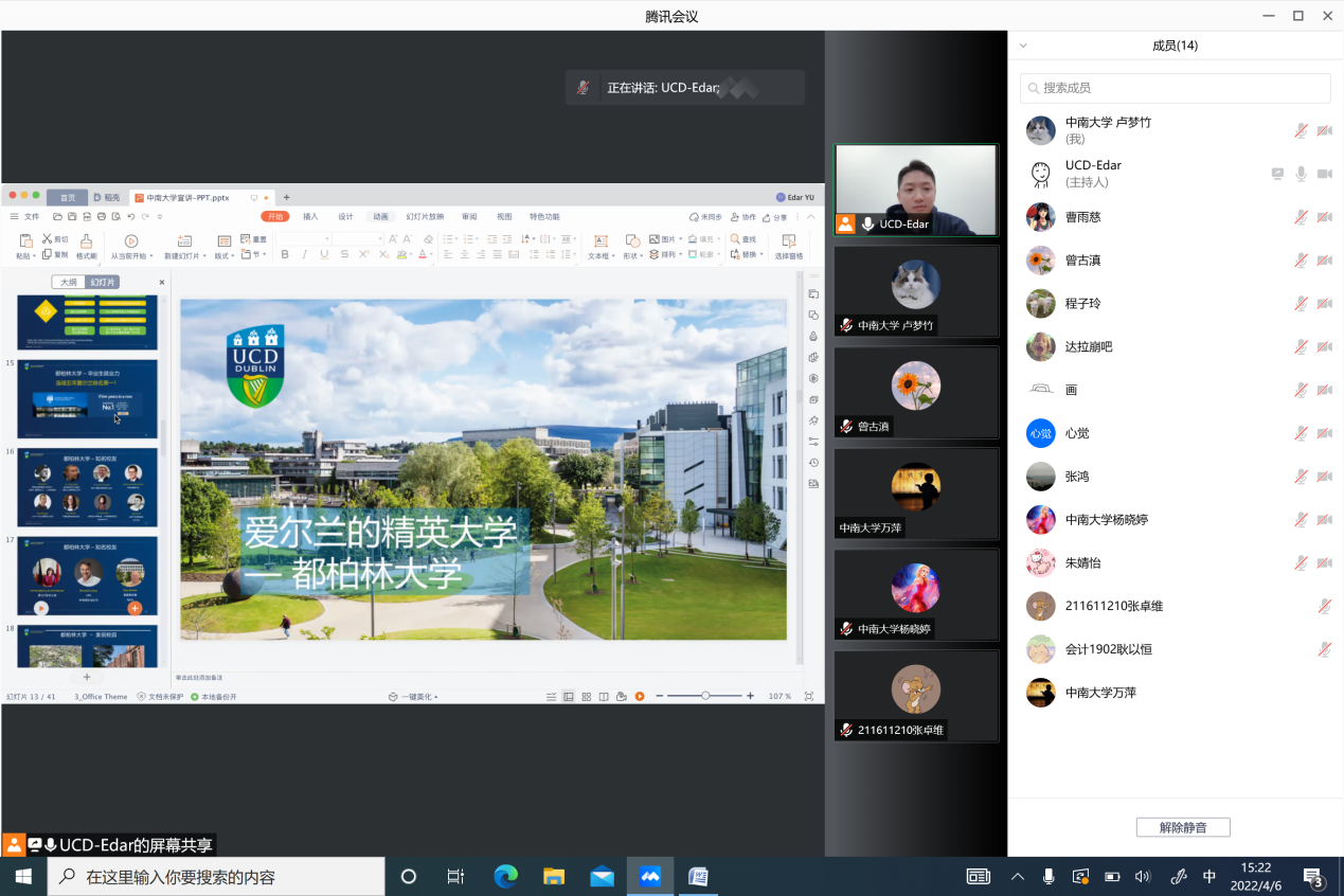 2022年4月6日下午,由XK星空体育牵头的星空XK-爱尔兰都柏林大学合作项目宣讲会在线进行,都柏林大学合作伙伴关系经理Edar老师就双方开展的2+2项目、study abroad项目、硕士直入项目进行在线宣讲,十几名学生积极参加。
