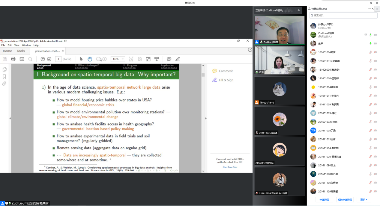 2022年4月14日下午4点,英国南安普顿大学卢祖帝教授做客星空XKXK星空体育经管学术论坛第188期,在线为星空官网师生带来了题为Exploring Spatio-temporal Network Lag-interactions: a Data-driven Semiparametric Modelling的主题讲座。讲座由XK星空体育副院长危平教授主持,邓超教授、王雄副教授、任晓航副教授等老师与各年级硕博士研究生共计260余人参加了本次讲座。