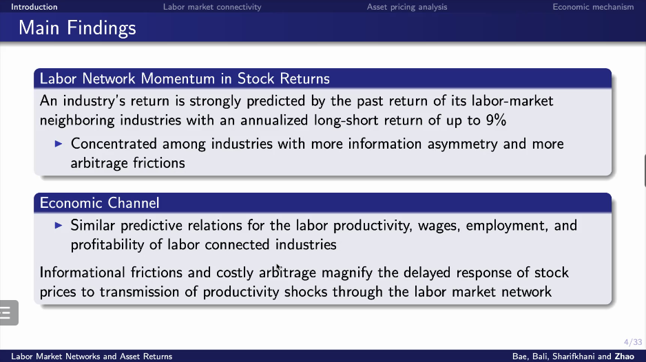 讲座伊始,赵晓飞副教授介绍了选题的动机。他指出劳动是一个重要的企业生产指标,先前的研究已经表明了在资产定价方面劳动力市场摩擦(labor market frictions)的重要性,同时,企业是单独的实体,也需要与劳动力市场进行交互。所以,本篇论文从劳动力市场网络出发,把它作为企业、产业生产力冲击的一个转移渠道。接着,赵教授提出了一种基于跨行业职业知识特征构成的相似性的劳动力市场连通性度量,并提供了通过劳动力市场连接的行业横截面的回报可预测性的证据。最后,结果显示,在多空投资组合中,一个行业的回报可以通过其与劳动力市场相关的邻近行业的过去回报来强烈预测,年化回报率高达90%,优于既定的资产定价模型。