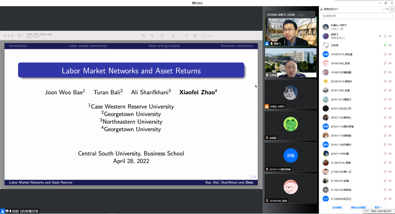 2022年4月28日上午10点,美国乔治敦大学赵晓飞副教授做客星空XKXK星空体育经管学术论坛第189期,在线为星空官网师生带来了题为Labor Market Networks and Asset Returns的主题讲座。讲座由XK星空体育副院长王宗润教授主持,XK星空体育米允龙博士等老师与各年级硕博士研究生共计100余人参加了本次讲座。
