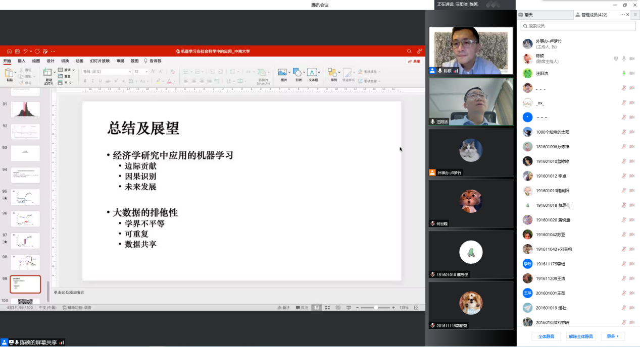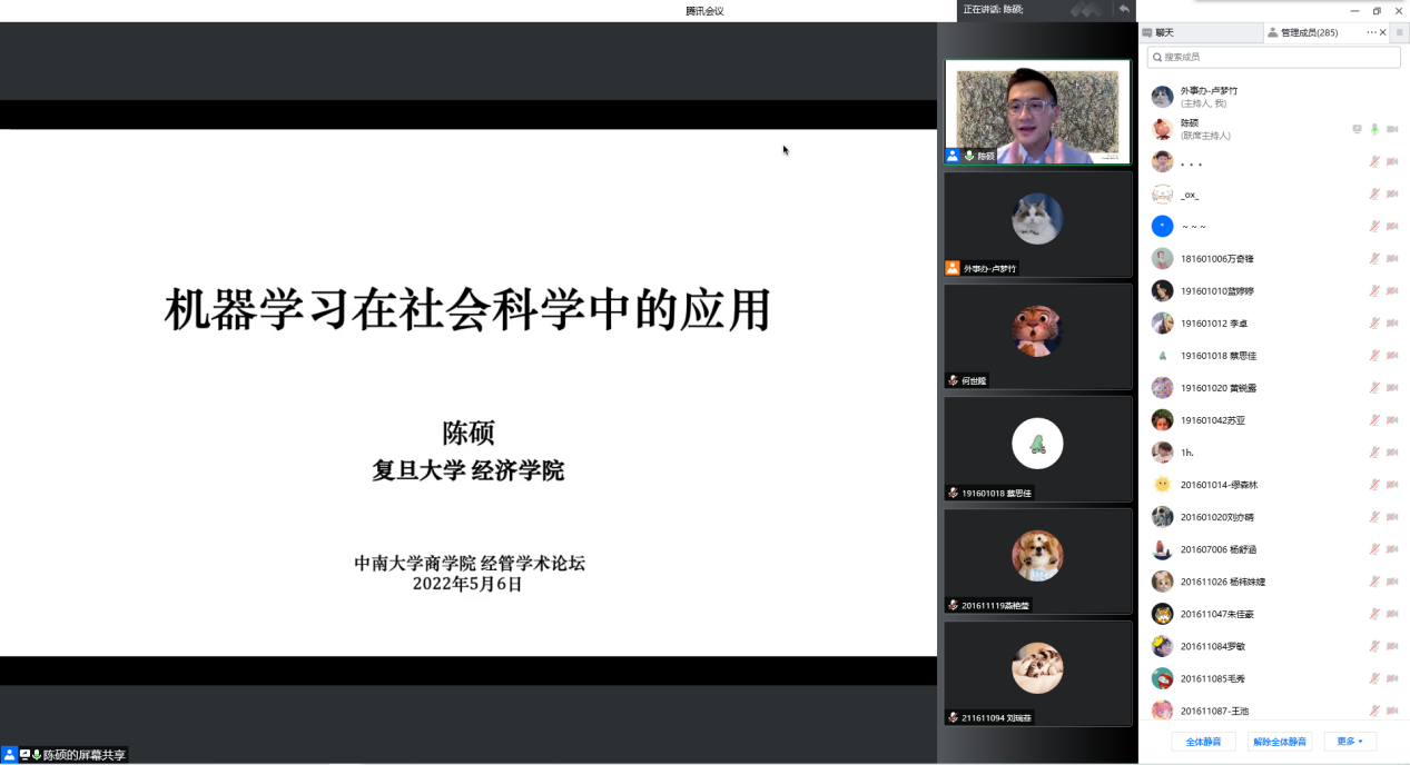 2022年5月6日上午10点,复旦大学经济学院陈硕教授受汪阳洁副教授邀请,做客星空XKXK星空体育经管学术论坛第190期,在线为星空官网师生带来了题为《机器学习在社会科学中的应用》的讲座。讲座由XK星空体育党委书记任胜钢教授主持,危平教授、许民利教授、周雄伟教授、安庆贤教授等十余名老师与各年级硕博士研究生共计440余人参加了本次讲座。