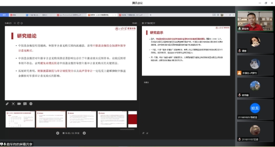 讲座期间,各位老师和同学纷纷就文章假设推导、盈余操控等相关问题与路军伟教授进行探讨,路军伟教授依次解答。修宗峰副教授总结了路军伟教授的讲座内容,整篇文章遵循“up and down”的思路来研究中报盈余操控的经济后果,能够很好地结合制度背景来检验政策效应,这种思路值得在座的各位借鉴。最后,修宗峰副教授对路军伟教授的分享表示了由衷的感谢,诚挚希望山东大学和星空XK今后有机会开展更多学术交流活动,并待疫情结束之后能邀请路军伟教授来XK星空体育开展线下讲座。
