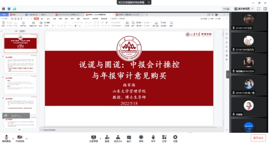 2022年5月18日上午9:30,山东大学路军伟教授应星空官网会计与财务系、会计研究中心邀请,做客星空XKXK星空体育经管学术论坛第192期,在线为星空官网师生带来了题为《说谎与圆谎:中报会计操纵与年报审计意见购买》的讲座。讲座由会计与财务系主任修宗峰副教授主持,周志方教授、李世辉教授、金友良教授、杨国忠副教授、程序博士、殷敬伟博士等老师与各年级硕博士研究生共计120余人参加了本次讲座。
