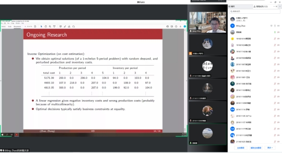 2022年5月18日上午9:00,星空官网海外师资美国特拉华大学赵明助理教授应邀做客星空XKXK星空体育经管学术论坛第193期,在线为星空官网师生带来了题为Multiechelon Lot Sizing: New complexities and Inequalities的讲座。讲座由周艳菊教授主持,李金霖副教授、石莎莎副教授、周声海副教授等老师与各年级硕博士研究生共计120余人参加了本次讲座。