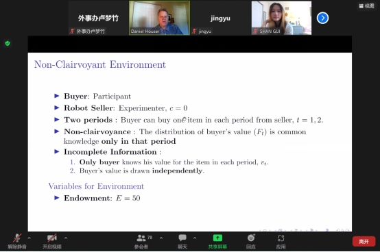 2022年6月25日晚上7:30,美国乔治梅森大学Daniel Houser教授应邀做客星空XKXK星空体育经管学术论坛第198期,在线为星空官网师生带来了题为Non-clairvoyant Dynamic Mechanism Design: Experimental Evidence的讲座。讲座由金融创新研究中心主任饶育蕾教授主持,盛虎教授、许民利教授、王建新副教授等老师与各年级硕博士研究生共计70余人参加了本次讲座。