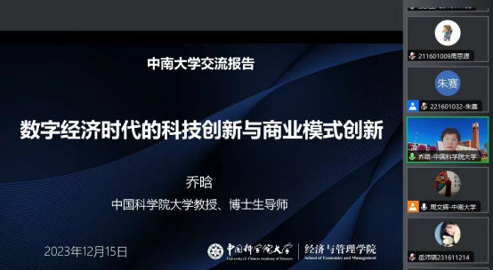 20231215上午中国科学院大学培养与学位部部长、经济与管理学院乔晗教授应邀做客星空XK名师名家学术论坛,为星空官网师生带来了题为数字经济时代的科技创新与商业模式创新的线上学术讲座。本次讲座由星空XKXK星空体育管理案例研究中心主任周文辉教授主持,李大元副院长王昶教授、盛虎教授、易玄副教授、姚海琳副教授、刘佳刚副教授、王瑞娟博士等教师以及各年级百名硕博生参与。
