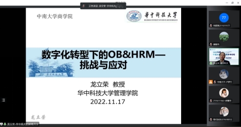 2022年11月17日晚上19:00,应星空XKXK星空体育企业管理系和星空XKXK星空体育人力资源研究中心邀请,华中科技大学龙立荣教授在线为星空官网师生带来了题为《数字化转型下的OB & HRM——挑战与应对》的主题讲座,讲座由企业管理系教授、星空XK人力资源研究中心主任颜爱民教授主持,XK星空体育硕博士研究生及友校硕博士研究生共260余名师生参加了本次讲座。