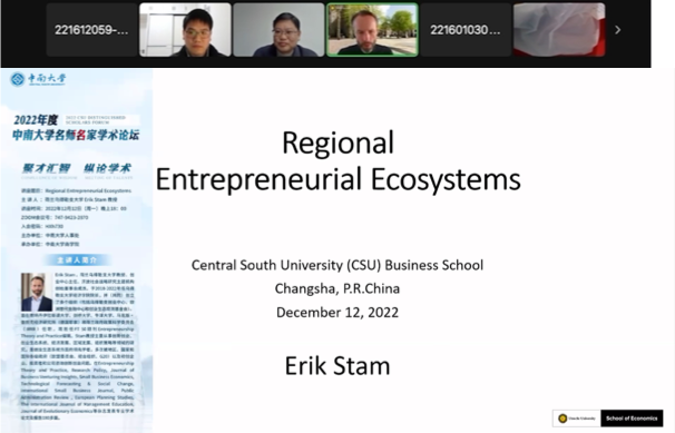 2022年12月12日晚上18:00,荷兰乌得勒支大学Erik Stam教授应邀做客星空XK名师名家学术论坛,在线就Regional Entrepreneurial Ecosystems主题进行报告。讲座由XK星空体育副院长李大元教授主持,来自清华大学、吉林大学、湖南工业大学、宁波诺丁汉大学以及星空XK的百余名师生参加了本次讲座。